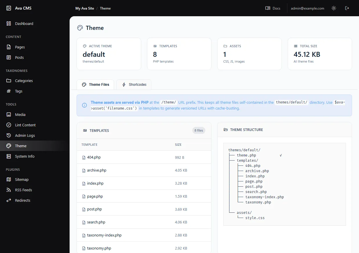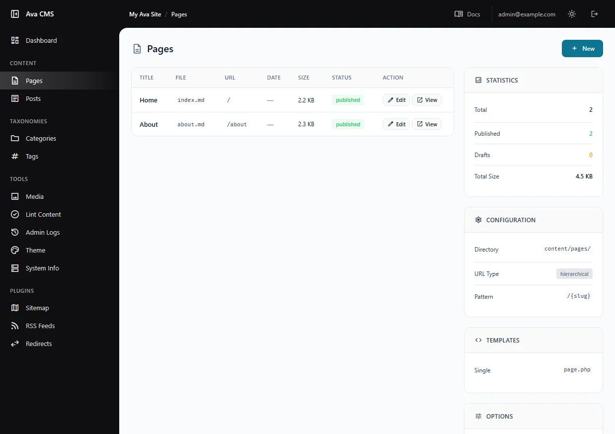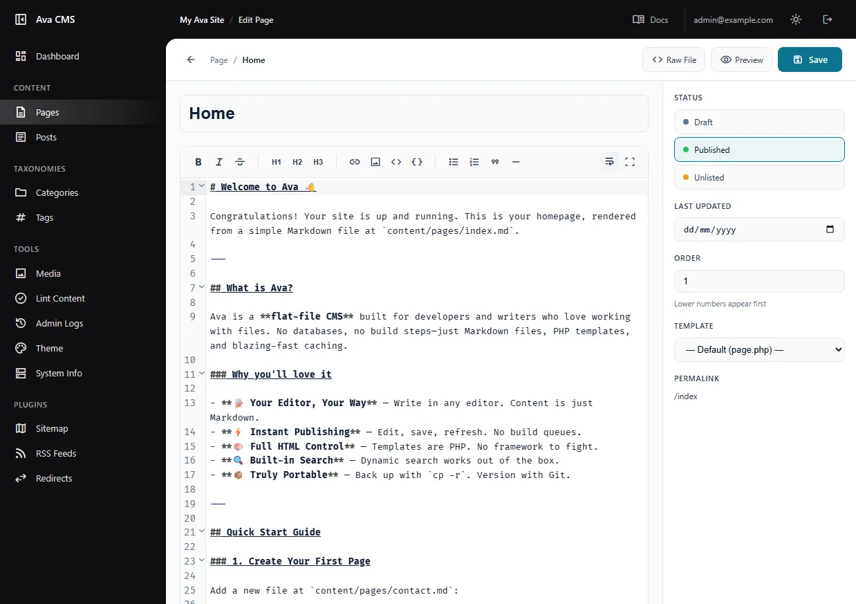 Ava CMS includes an admin dashboard — a complete content management interface that makes working with your site a breeze. Create and edit content with full custom field support, manage media, organize taxonomies, and monitor your site's health.