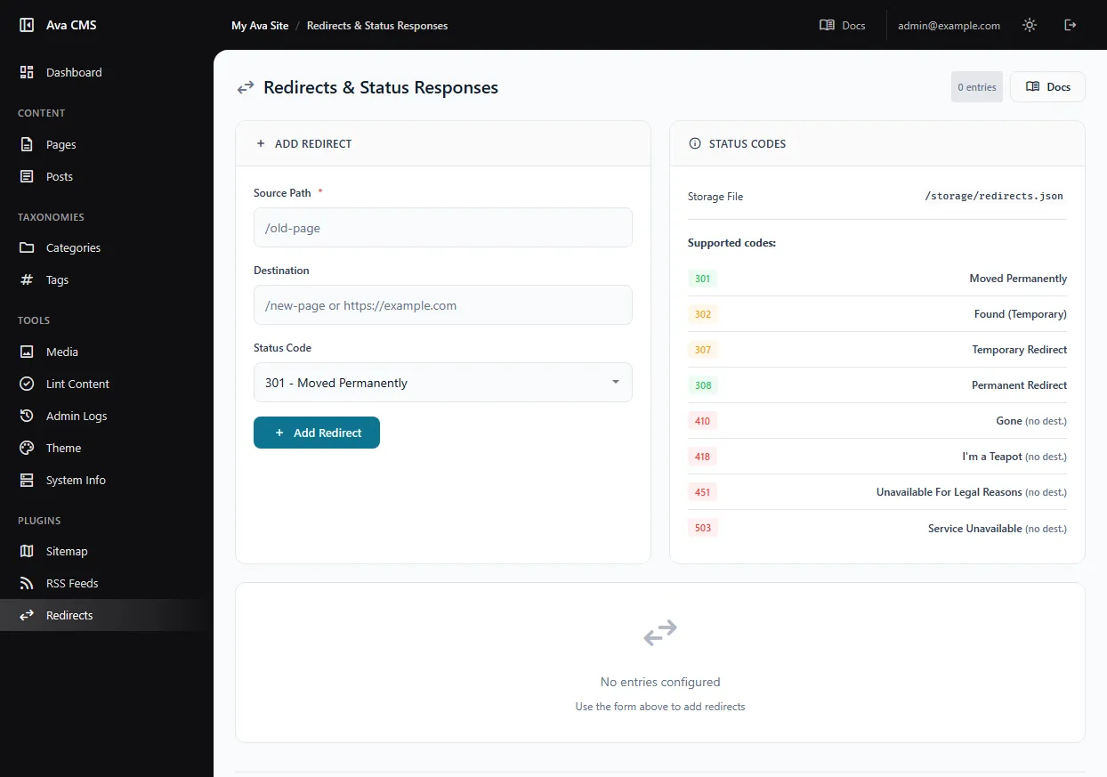 Example: The Redirects plugin adds a complete redirect management interface where you can create, edit, and delete URL redirections — all within the admin.